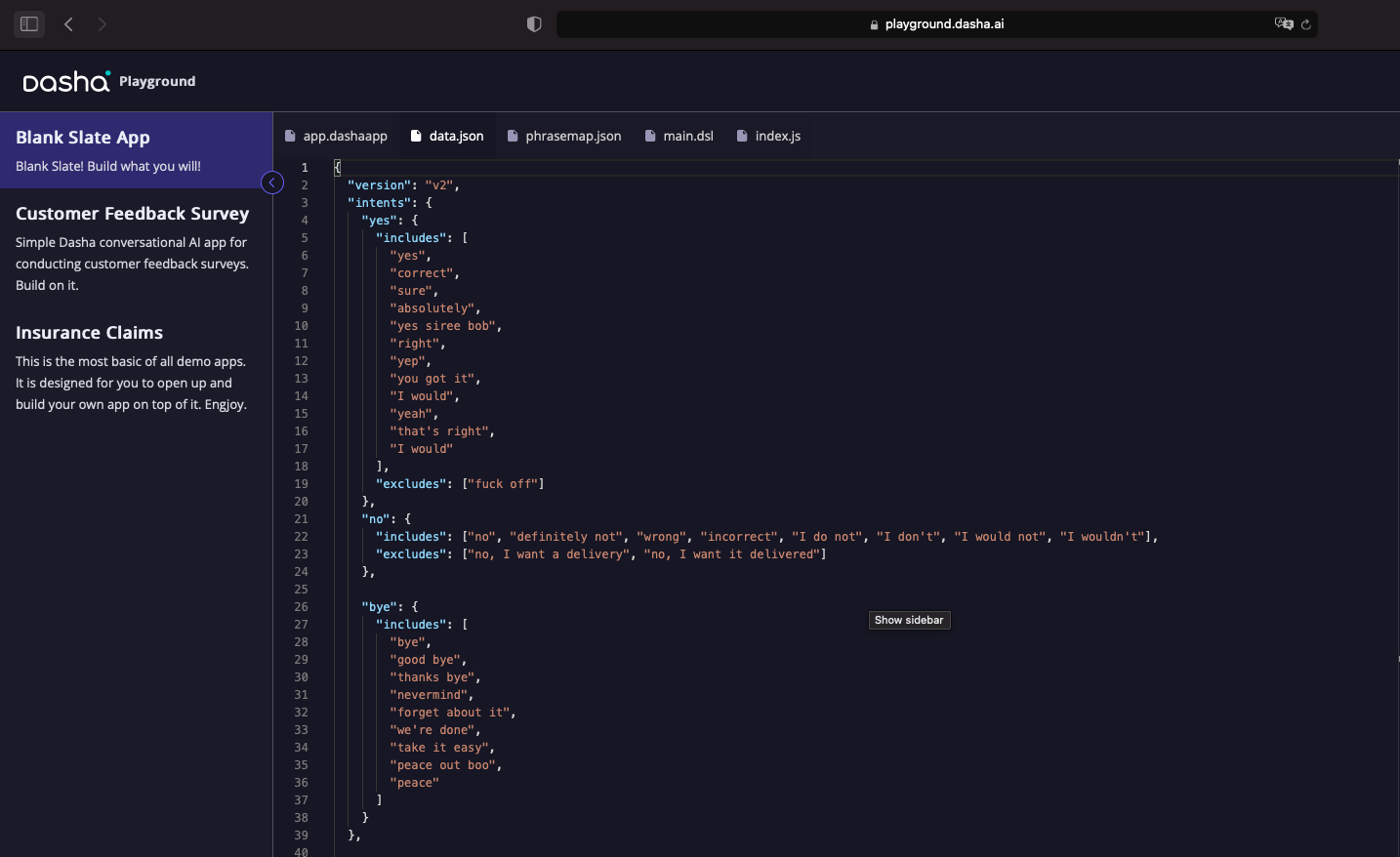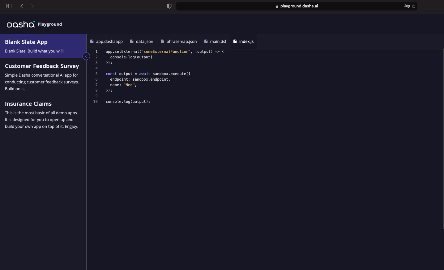 - index.js Is a server-side JavaScript file. If you have used Dasha in VSCode, you know that this is where you use the Dasha SDK to connect your AI app to the Dasha Cloud Platform. In the Playground that connection establishes directly, the SDK is not used in the index.js file. Still the same, you can use index.js to create external functions that your AI app can use to communicate with external APIs or anything else you can think of.