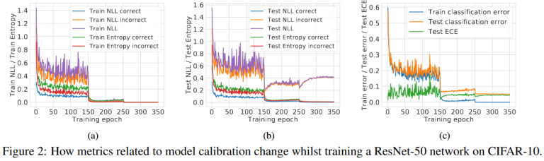 They are more likely to suffer from being over-confident. Firstly, this happens because when training neural networks on calibration set, accuracy is monitored, not paying attention to confidence. The figure below shows graphs of different metrics when training neural networks. Secondly, modern networks are very complex, which leads to overfitting (even if NLL decreases on the training set when the network is trained, on the test set the NLL can increase, (see the figure below).