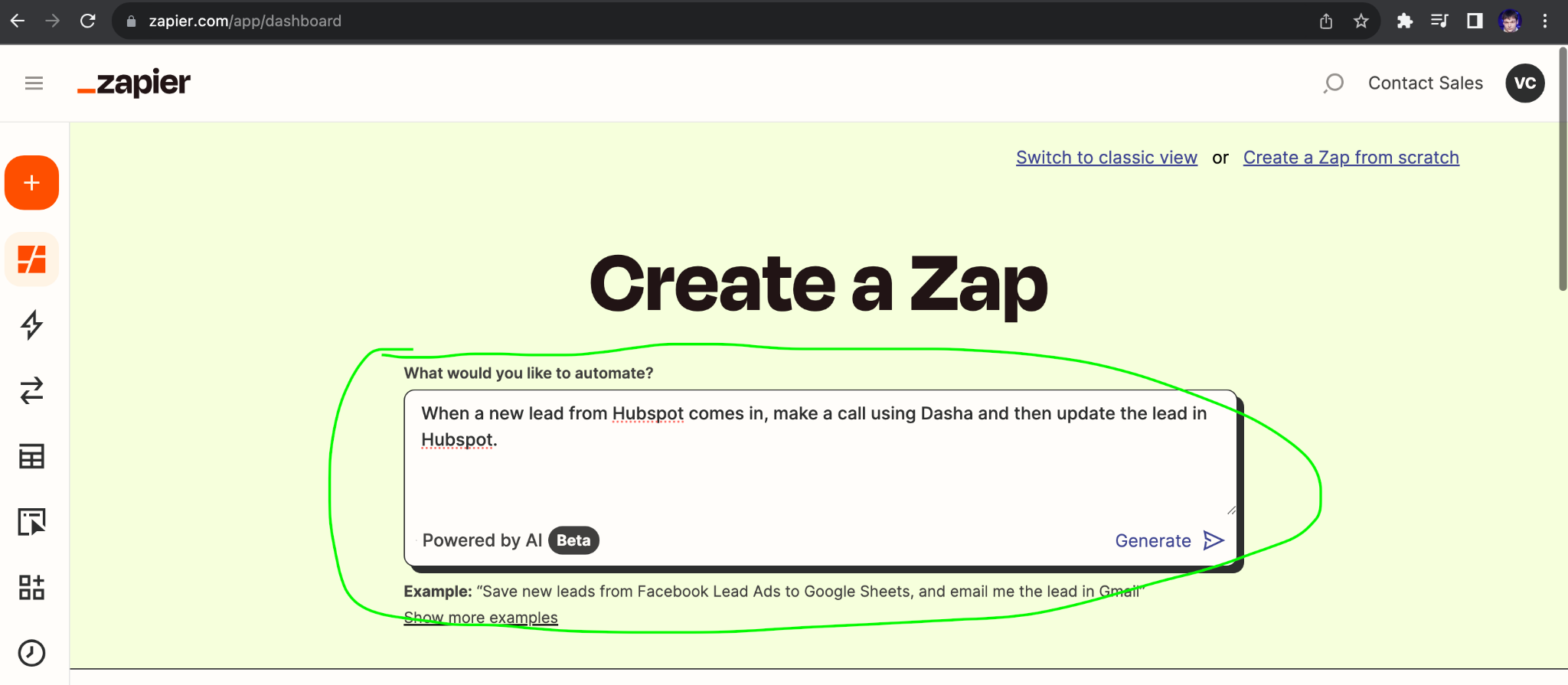 - In the "What would you like to automate?" field, describe your process, like "When a new Hubspot lead comes in, make a Dasha call and update the lead in Hubspot." Then click “Generate”.