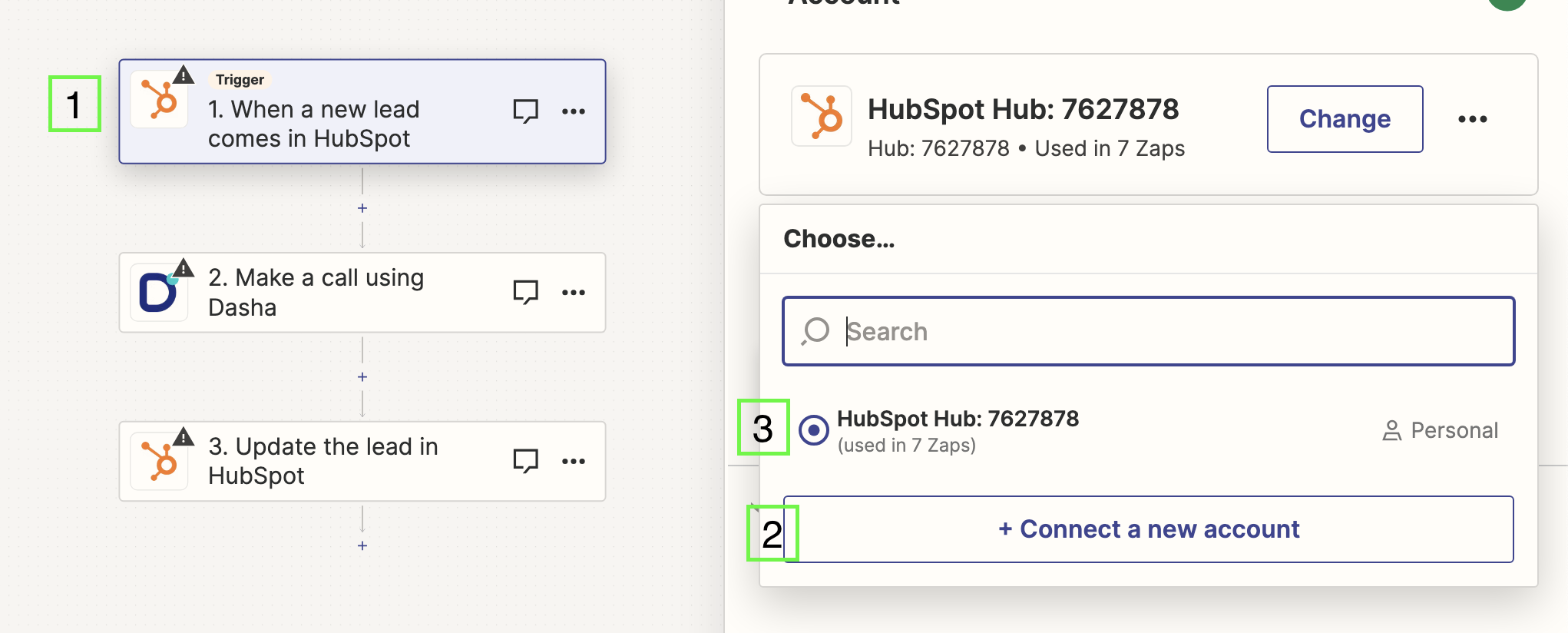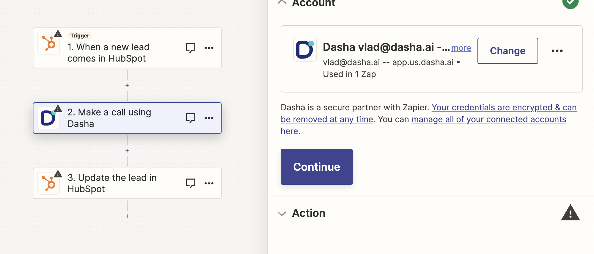 - Connect a new account (your CRM, database, etc.) and follow the prompts to integrate it with Dasha.