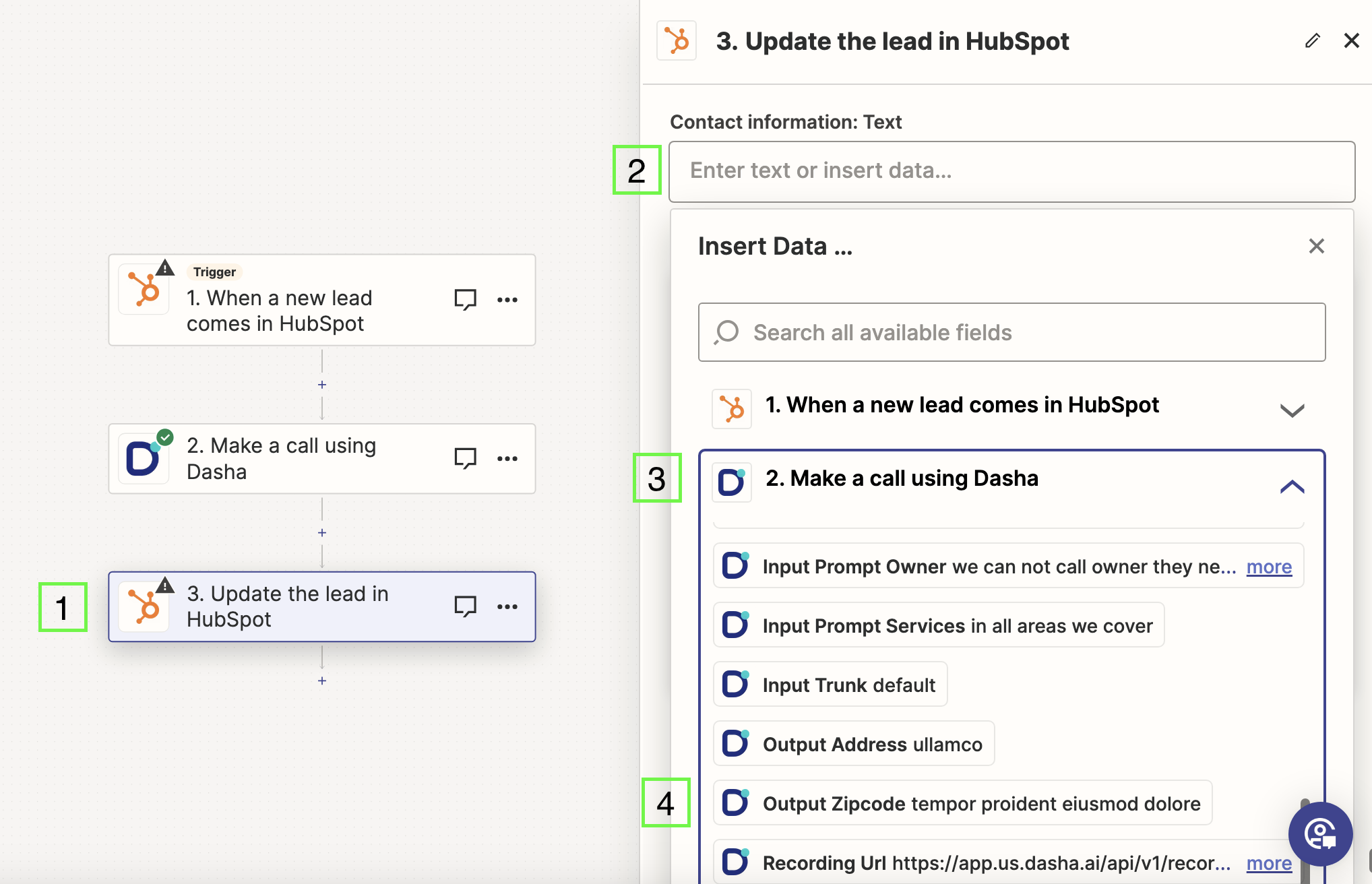 - Map the fields between your CRM/tool and Dasha bot’s output variables.