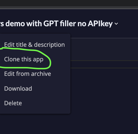 - Create your Dasha bot using the Template Bot. Clone the app to your workspace by putting the mouse over the bot name and clicking “Clone this app”.