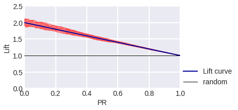 The black diagonal line on fig. 8-10 shows the Gain Сurve for a random algorithm: it is clear that if the algorithm considers the random share of PR of all objects to be a positive class, we expect that the share of objects of class 1 that the algorithm considered positive to also be TPR = PR. The higher our curve is in relation to the diagonal, the better. The ratio of the heights of the Gain curve and the diagonal line is often depicted as a Lift Curve (Chart): it is plotted in PR and TPR/PR coordinates. Fig. 11-13 show the Lift Curves corresponding to the above Gain Curves.