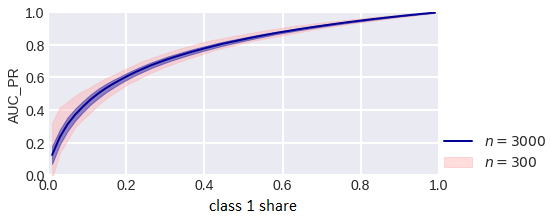 fig. 3 Fig. 4 shows the way the empirical estimate of the PR curve area depends on the sample size for different proportions of classes: when the classes are equally probable and when there is an imbalance in classes. The lighter area shows the standard deviations from the mean. It can be seen that SDs are larger in a problem with class imbalance.